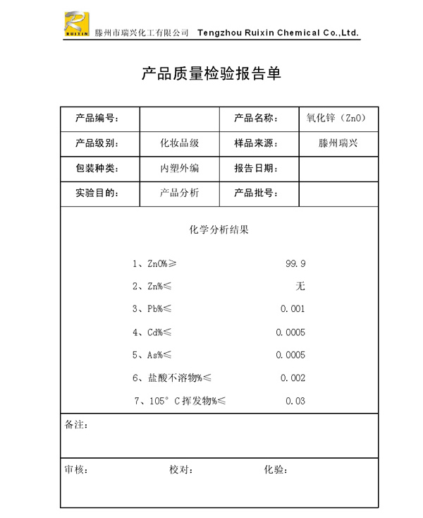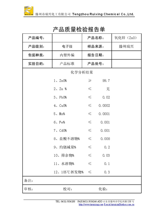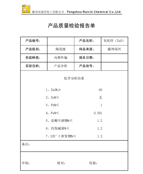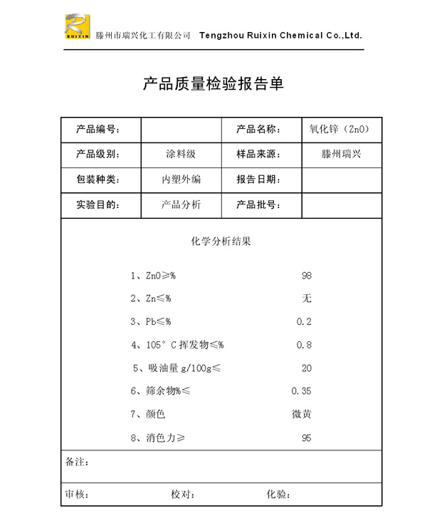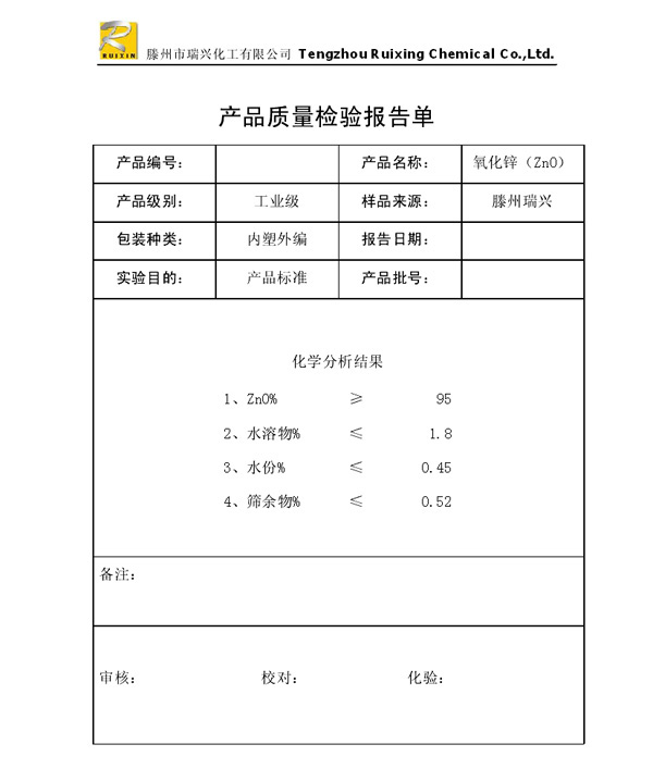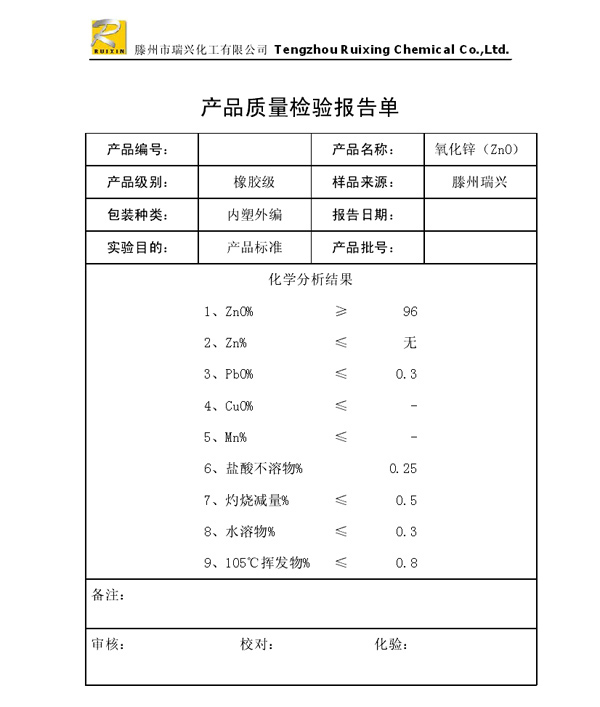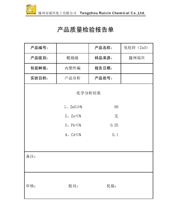 瑞興化工有限公司是生產(chǎn)氧化鋅的重點(diǎn)企業(yè),于2008年通過(guò)ISO9001:2008質(zhì)量管理體系認(rèn)證?!叭鹋d”牌氧化鋅在國(guó)內(nèi)擁有較大穩(wěn)定的市場(chǎng),并遠(yuǎn)銷東南亞、中東、中南美等國(guó)家和地區(qū),在國(guó)內(nèi)外享有較高聲譽(yù)。